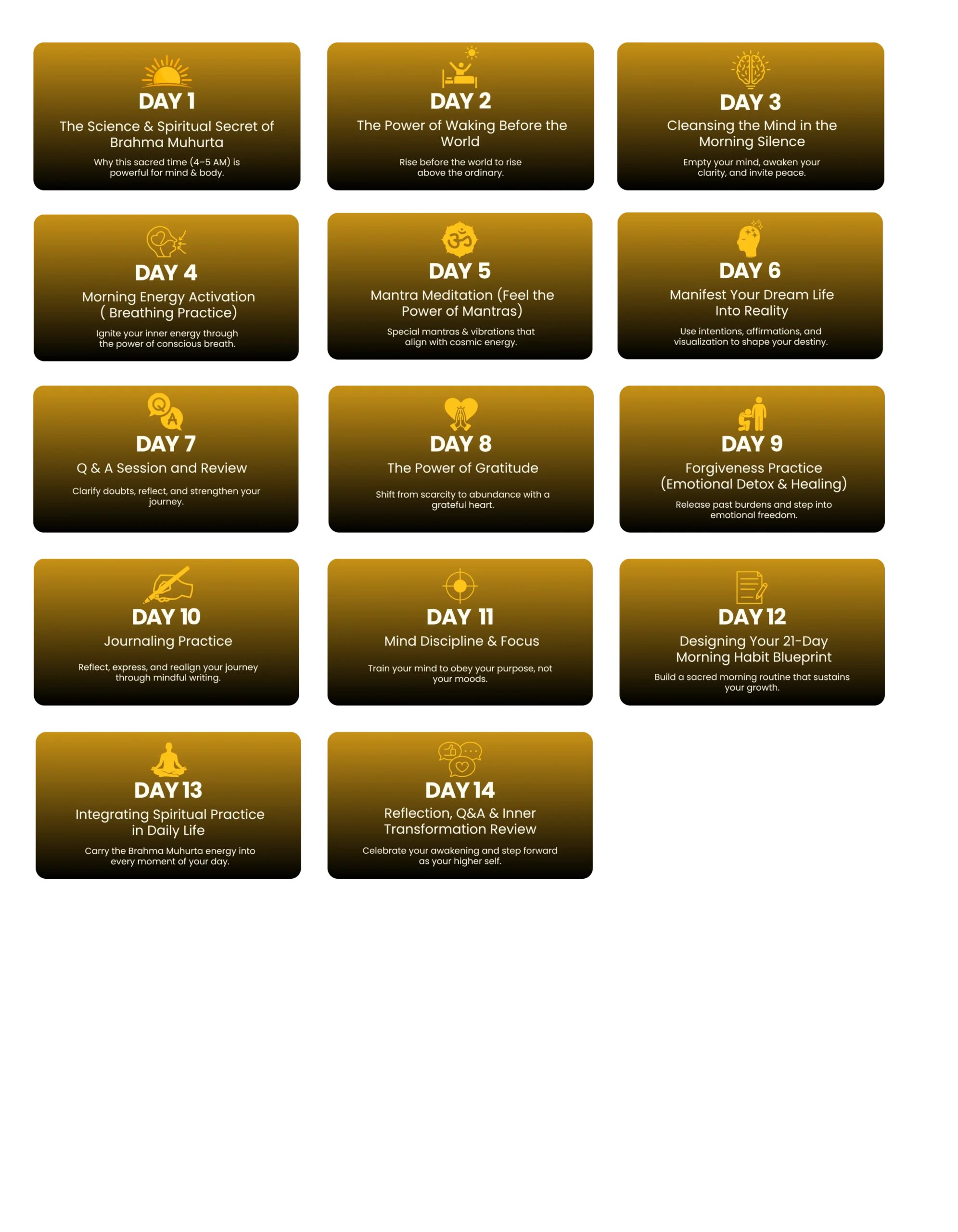 Itβs a 14-day guided morning program designed to help you awaken before sunrise, align with divine energy, and build a consistent spiritual morning routine through meditation, mantra, breathwork, gratitude, and reflection.